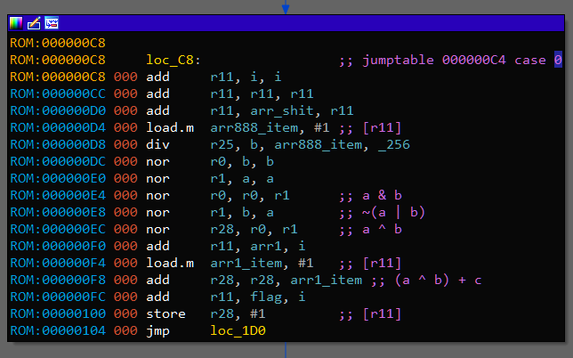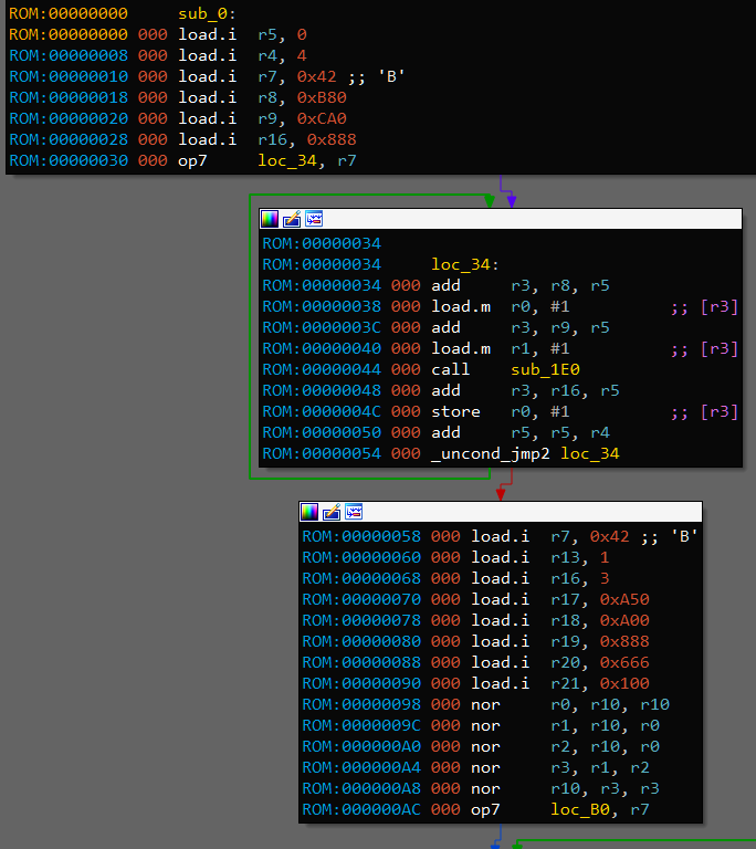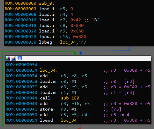 This is the part where I took a wild guess and declared that instruction 7 is loop_start and _uncond_jmp2 is loop_wrap. On this picture it means that loop counter is r7 because it is passed to loop_start. Processor associates register r7 with location loc_34 and uses this information to decrement and check r7 when execuitng instruction loop_wrap loc_34. Loops like this are used in other places too, and in the end this guess is right. For the sake of readibility, I’ll call these instructions lpbeg and lpend respectively.